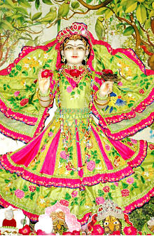 6) Oh Vṛndā, devotees who have the desire to participate in the rāsa-dance, who long to live eternally in Vṛndāvana, and who seek service to the lotus feet of your lords, easily attain ever lasting fulfillment of all their desires by your mercy. We offer obeisance to your lotus-feet.